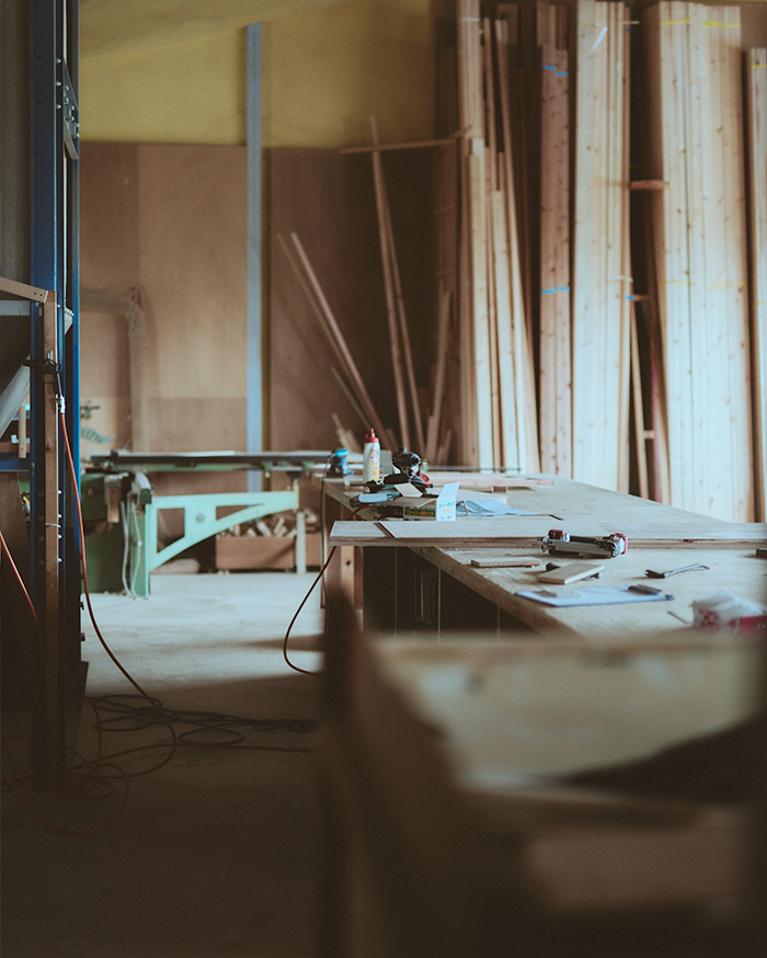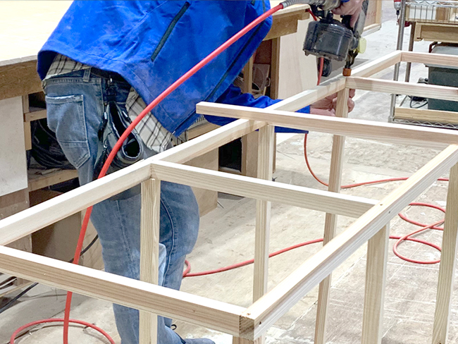 京都と千葉に構えた自社工場には、精工な造作物を作る技術を持った職人が在籍。デザイン性の高い什器や装飾も、熟練の手と最新設備により実現可能です。展示会ブースに欠かせない壁となる木工パネルも、大量生産が可能な体制を整えており、大規模ブースも対応しています。