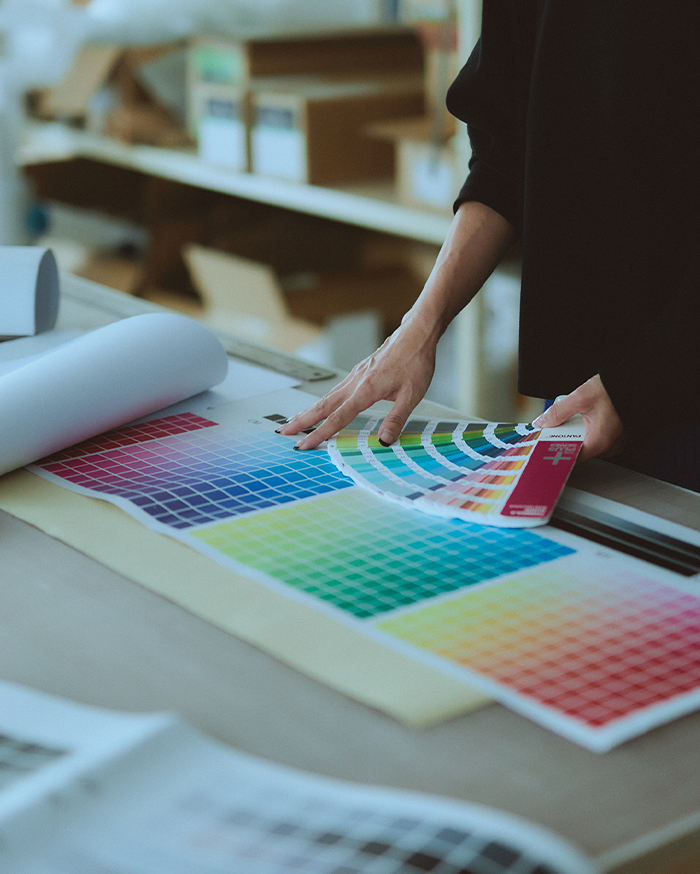 More展示会では、社名看板・説明パネル・誘導サインなど多くのグラフィックデザインが必要になります。一瞬で伝わる、印象づけるデザインを心がけ、空間全体との調和も重視して制作。使用するメディアも、紙・クロス・布など様々な素材の中から最適なものを選定します。