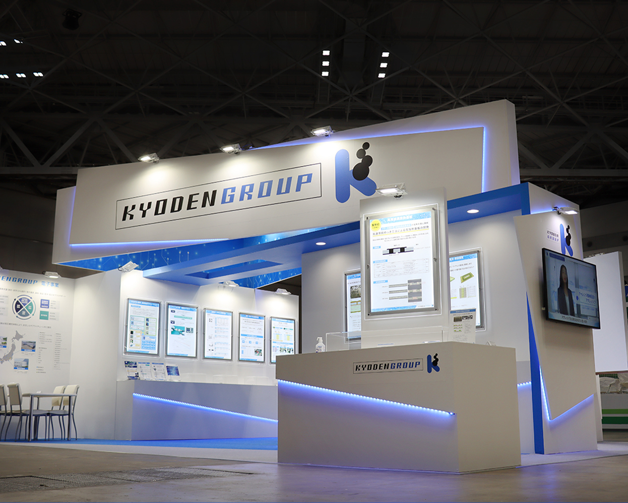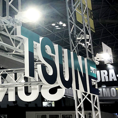 展示会では主に発泡スチレンボードやカルプ(発泡ウレタン樹脂)等を切り出し、立体的な装飾としてブースに設置することで社名ロゴやキャッチコピーを目立たせることができます。より大きなものになると木工造作で作る場合や、チャンネル文字といわれる光る文字も人気があります。