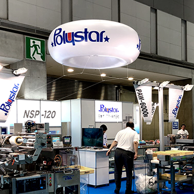 ブースの上空にバルーンを浮かせるのは展示会ならではの装飾です。広い会場の中で遠くからも見つけやすいため、集客も抜群。 球体・キューブ・ドーナツ型のバルーンに企業名を入れるのが主流ですが、イメージキャラクターや製品の形をバルーンにするのもオススメです。