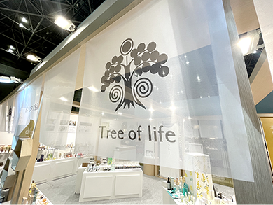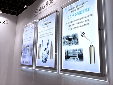 ブースの中でもひときわ目を引く装飾方法で、社名ロゴを光らせることが多いです。木工造作の一部分に、社名ロゴの形を抜いたベニヤと半透明のアクリルをはめ込み、内部に照明を仕込むことで綺麗に光る抜き行灯となっています。