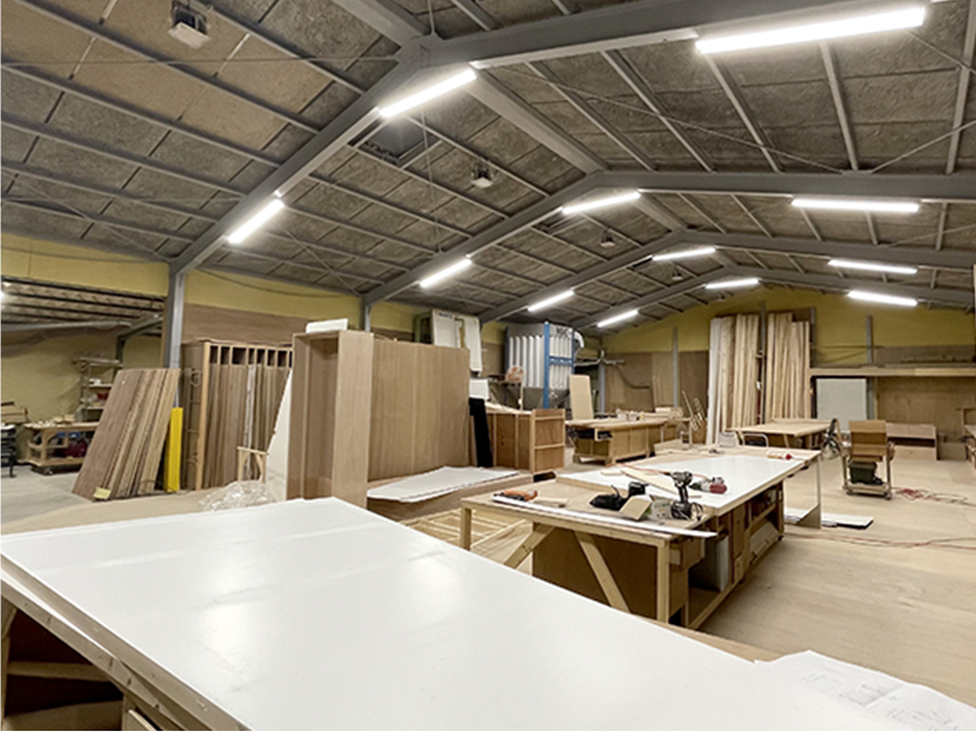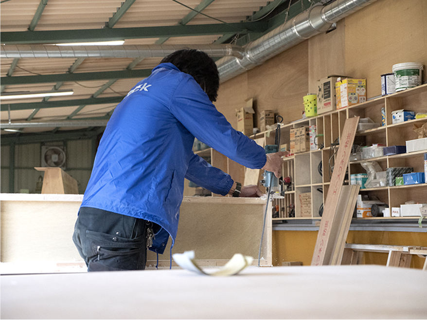 工場長になってから10年以上経ちますが ”工場の流れを止めない” という事を心掛けています。 展示会やイベントの木工造作が多いため1週間で10件以上の案件を抱える時もありますが、個人に負担がかかりすぎないようスタッフの業務バランスにも注視しています。 読みが甘く工場のスケジュールが空いて止まってしまうということがないように無駄なく効率よく工場を回す。それが結果的に品質を担保しコストを抑えられ、お客様のためになると考えています。