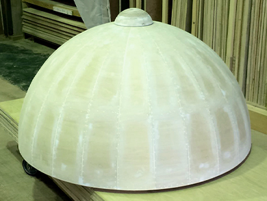 薄いベニヤ板を20枚以上繋ぎ合わせてドーム形状を再現した木工造作。少しの歪みも許されない難易度の高い造作で、ベテランの職人が手を掛けて完成させました。 おもちゃショー2018にてお城を再現したブースのドーム部分に使用しました。