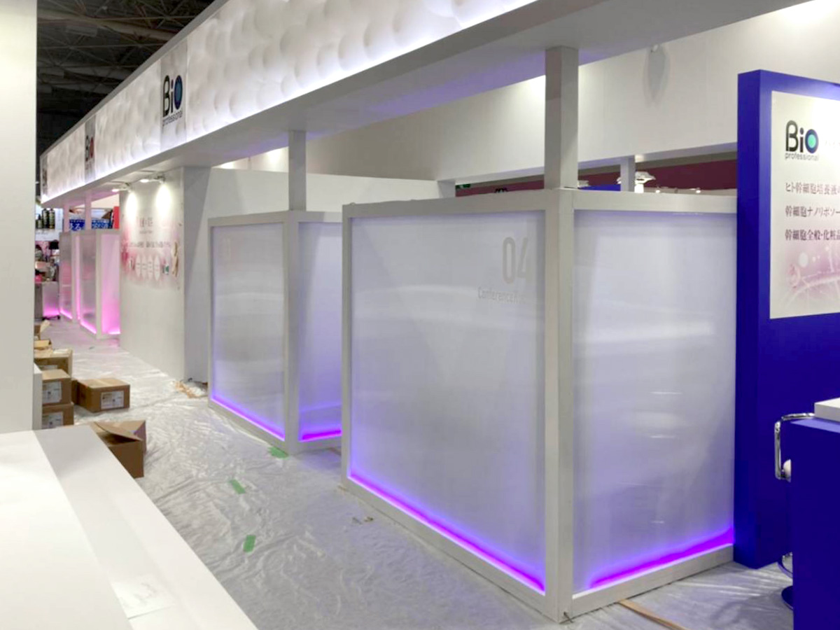 施工のみ弊社で担当させていただきました。25.5m×9mの大迫力な巨大ブースが、色分けにより姉妹ブランドとわかるようになっています。パラペット部分にはバルーンが詰められていたり、間接照明やカラーライティングなどこだわりが盛りだくさんなブースです。