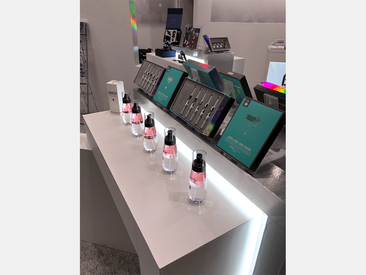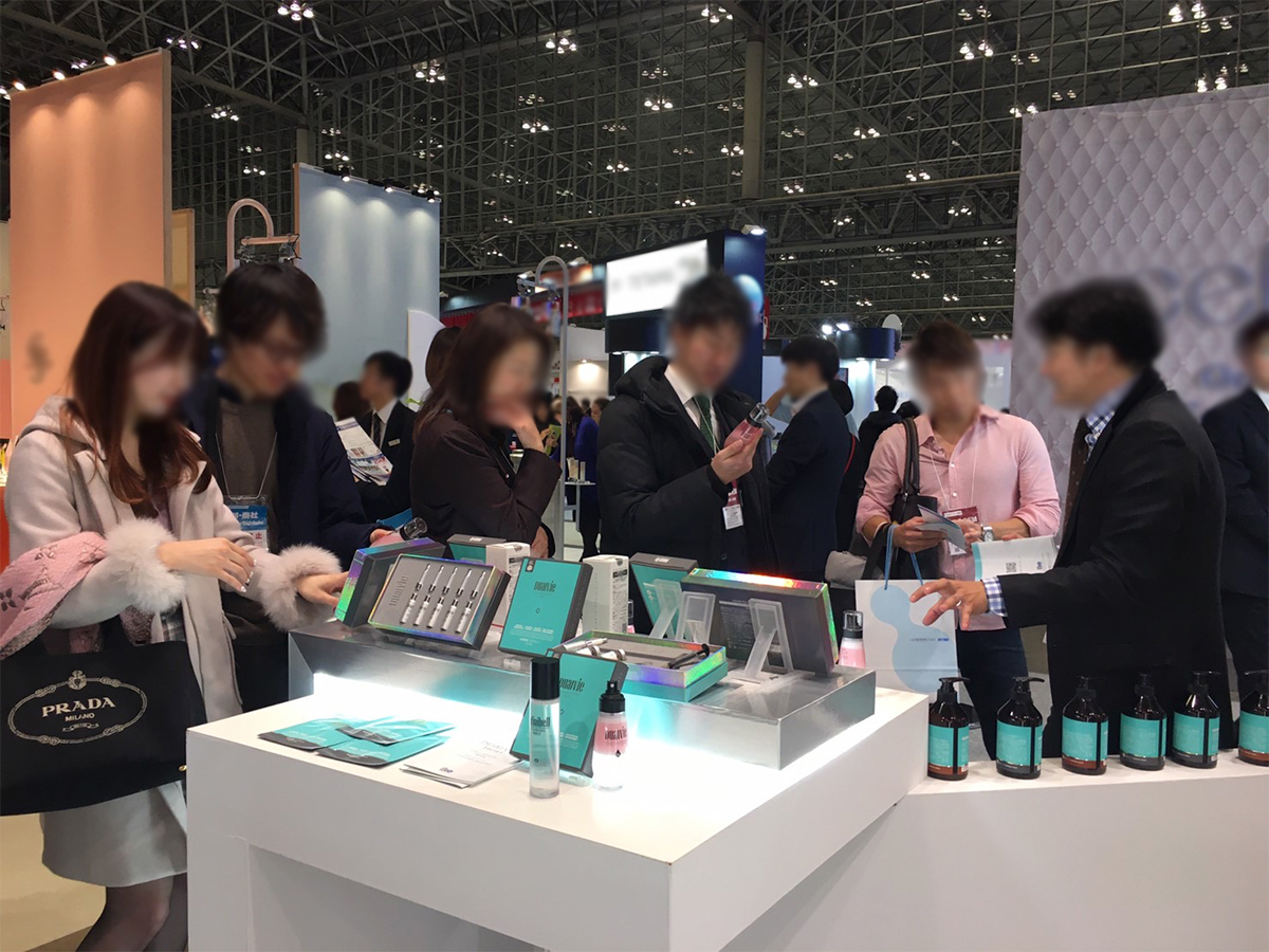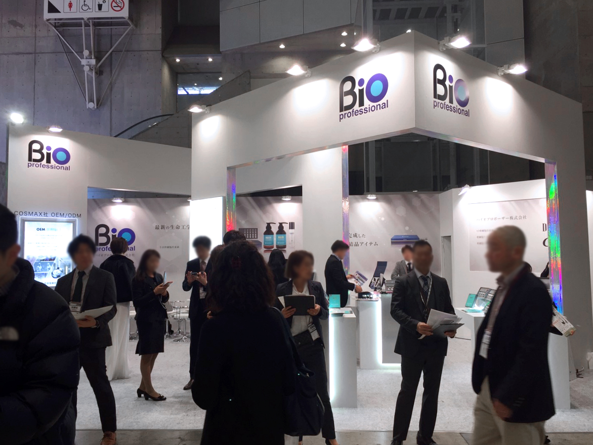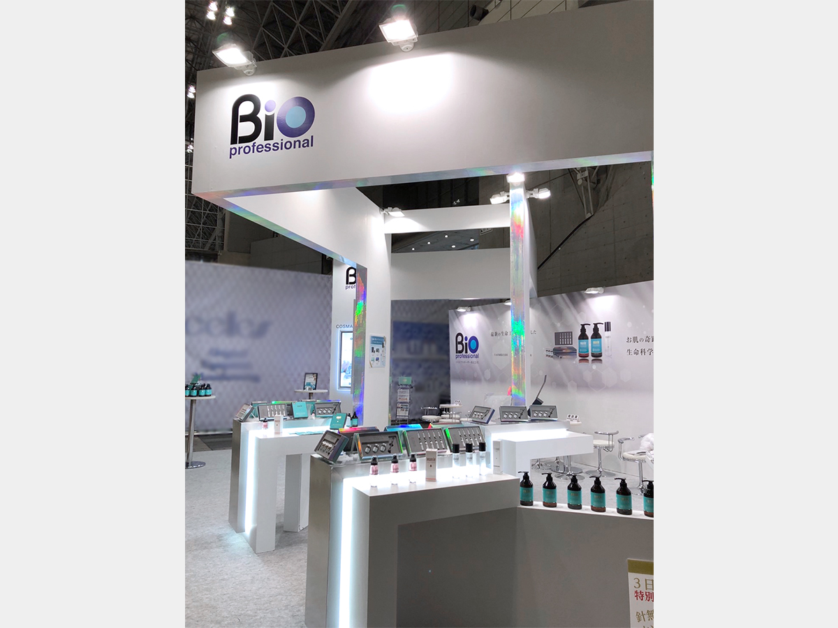 女性クリエイティブチームによる女性目線を活かしたブースデザイン。シンプルに計算されたブースはメインのグラフィックも女性デザイナーが担当。商品パッケージと小口のホログラムがマッチし、BIOなイメージに。ホログラムを使う分、展示台の照明でニュアンスを加え、幻想的な雰囲気を演出。女性ならではの繊細と大胆さを発揮し「美容×BIO」を表現したブースとなりました。