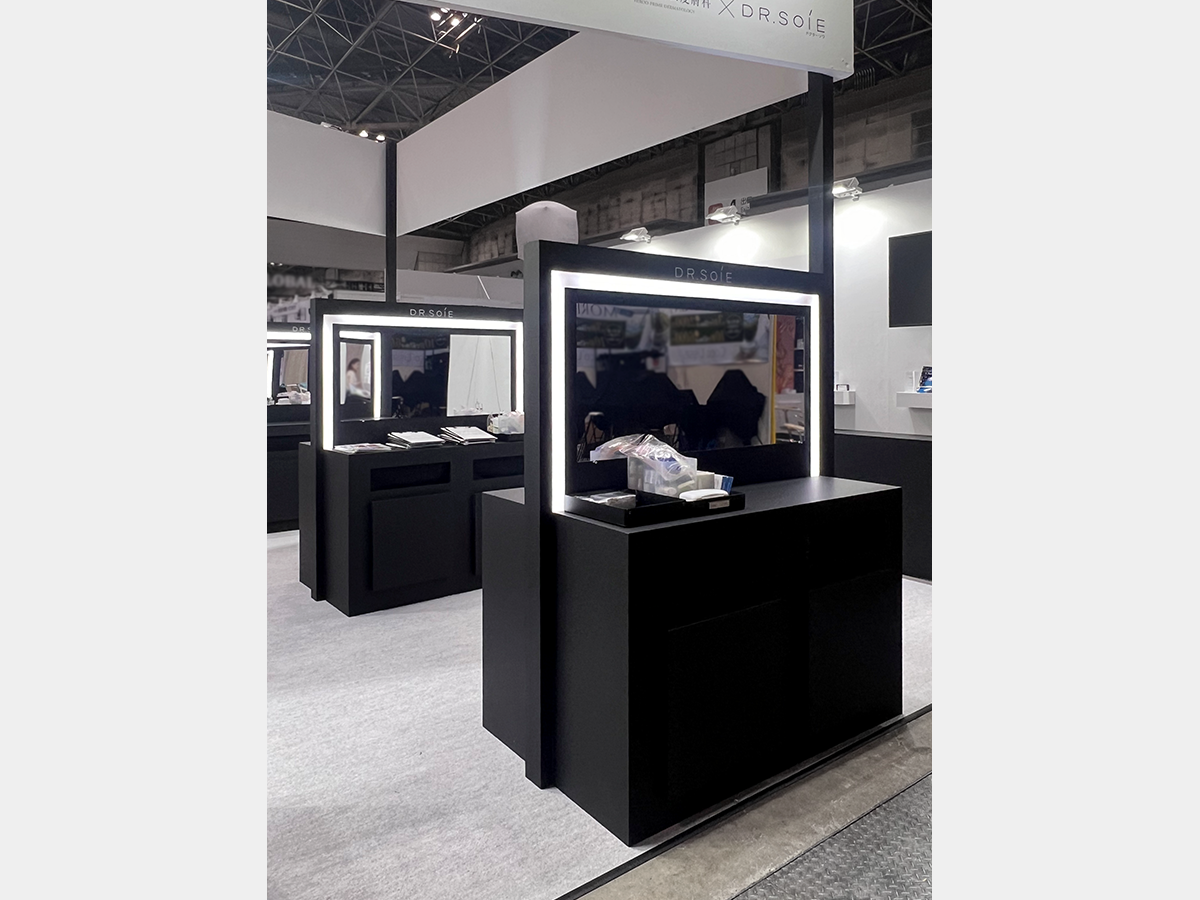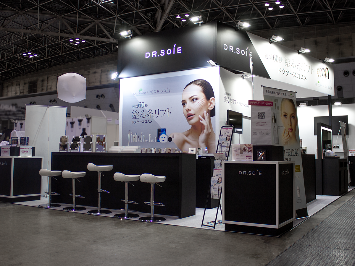 デザイン設計から施工まで担当させていただきました。集客やスタッフの動線等を意識した、レイアウト重視のブースデザイン。ステージ、カウンター、展示台など構成要素が多い中、白と黒を基調としてまとまりのあるブースに仕上げました。