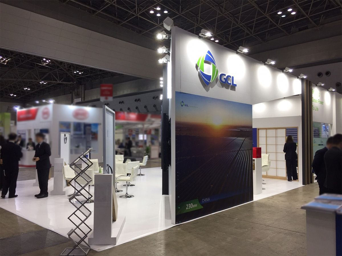 中国から例年ご依頼いただいています。今年も内照式の大型看板をアイキャッチに、社名のGCLのグラフィックが世界観を伝えています。ところどころに障子など和のテイストも加え先進的なブースデザインとなりました。