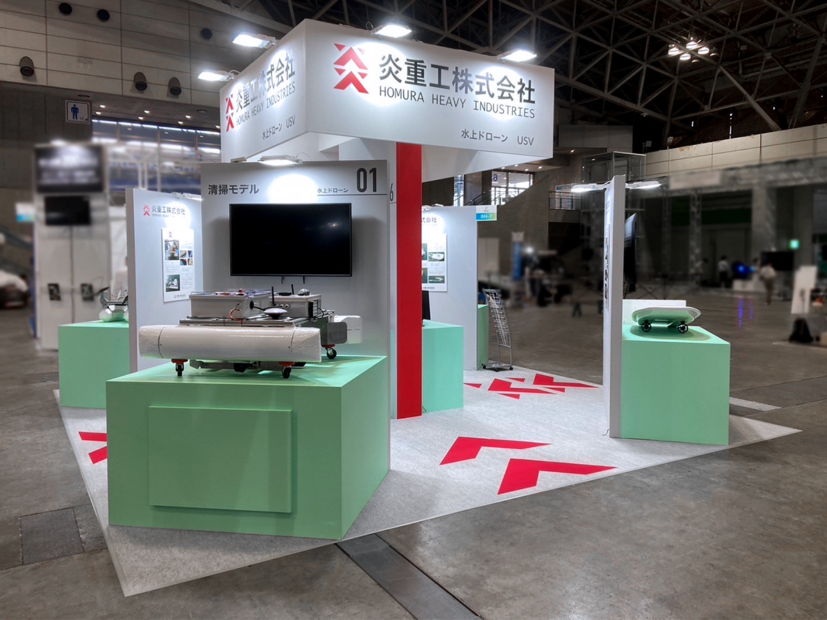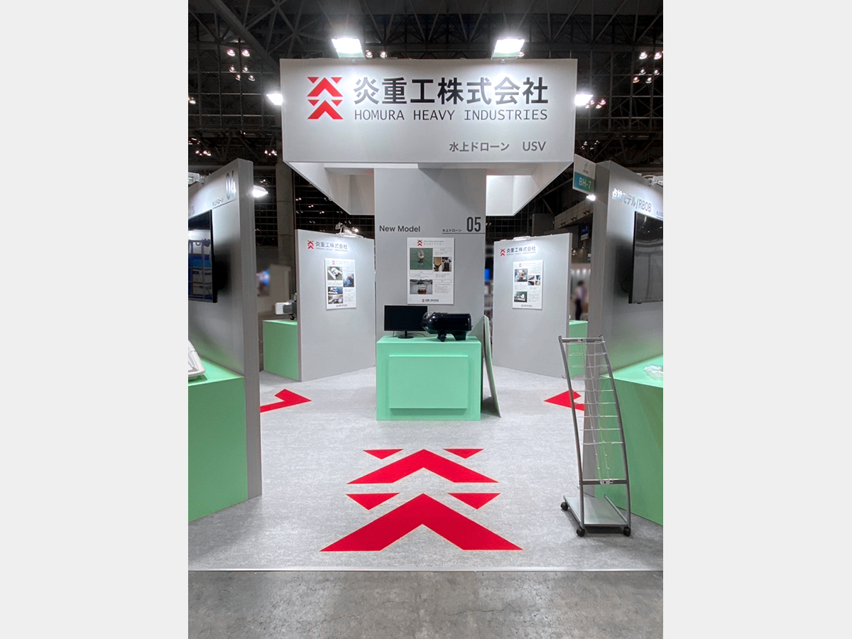 デザイン設計から施工まで担当させていただきました。4面開放のオープンスペースを生かしたレイアウトに、炎重工様のロゴである炎を矢印として床に展開。ブース内部へ誘導するサインとして機能しています。使いたいカラーとしてご指定頂いたミントグリーンが、来場者の目を引くブースデザインとなりました。炎重工株式会社様公式サイト:https://www.hmrc.co.jp