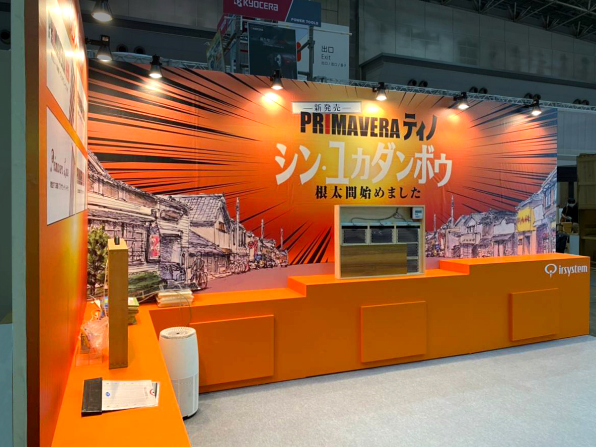 床暖房の暖かさをイメージしたオレンジブース。クライアント様のご希望で昭和レトロ風なグラフィックを制作させていただきました。(株)アルシステム様公式サイト:http://www.irsystem.jp