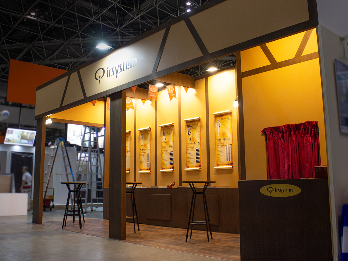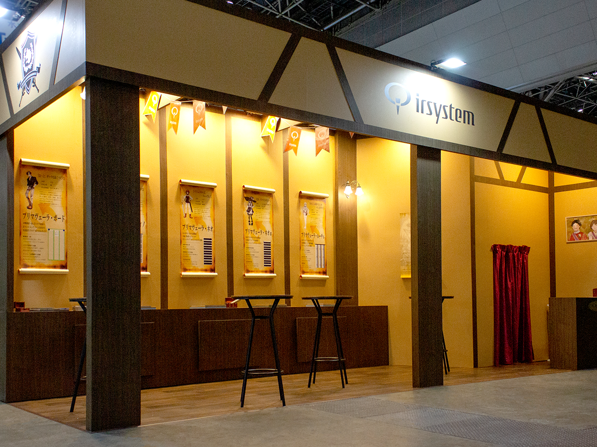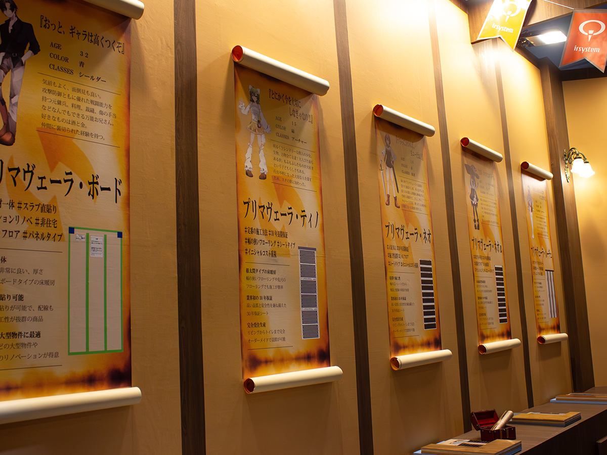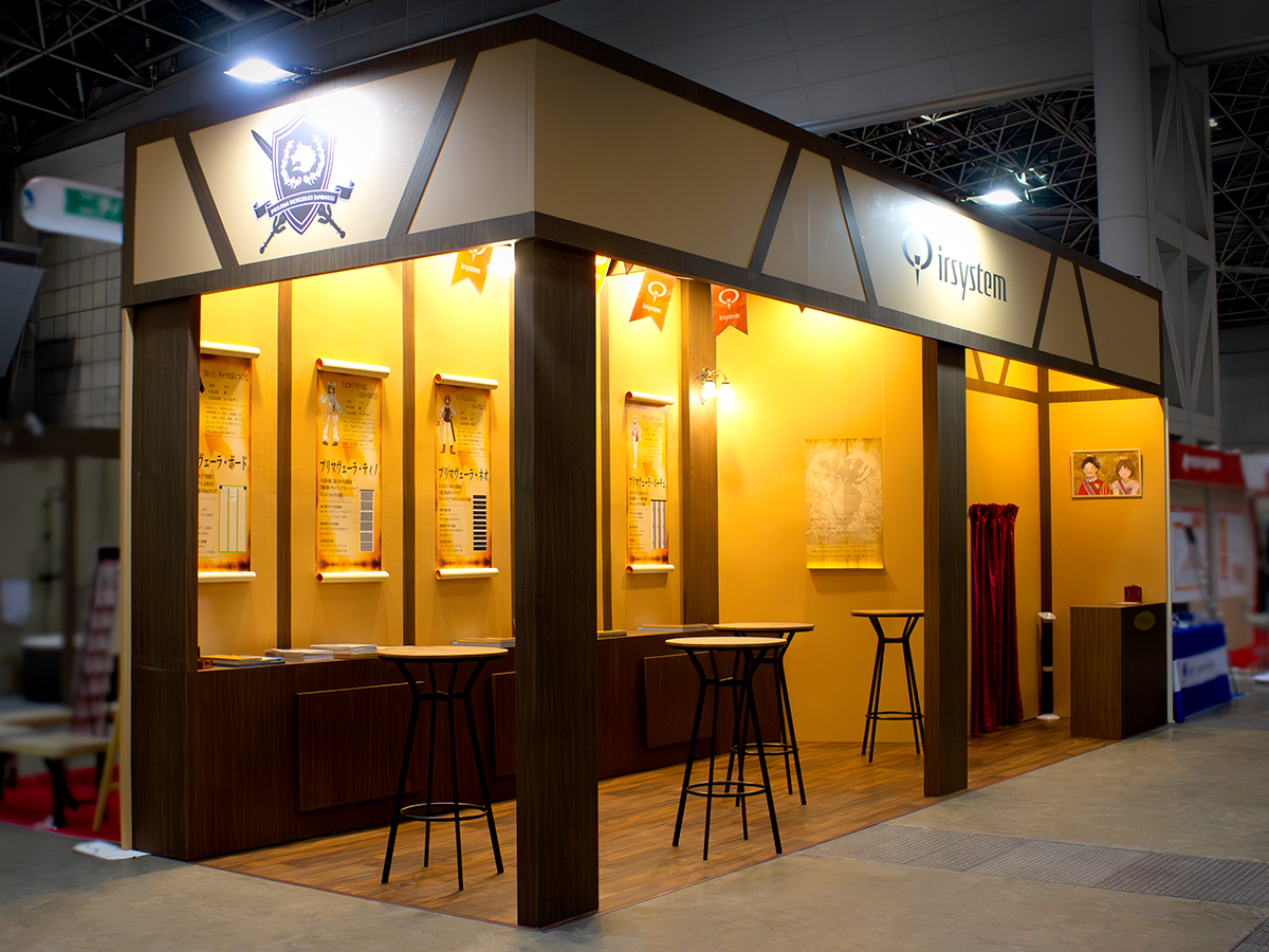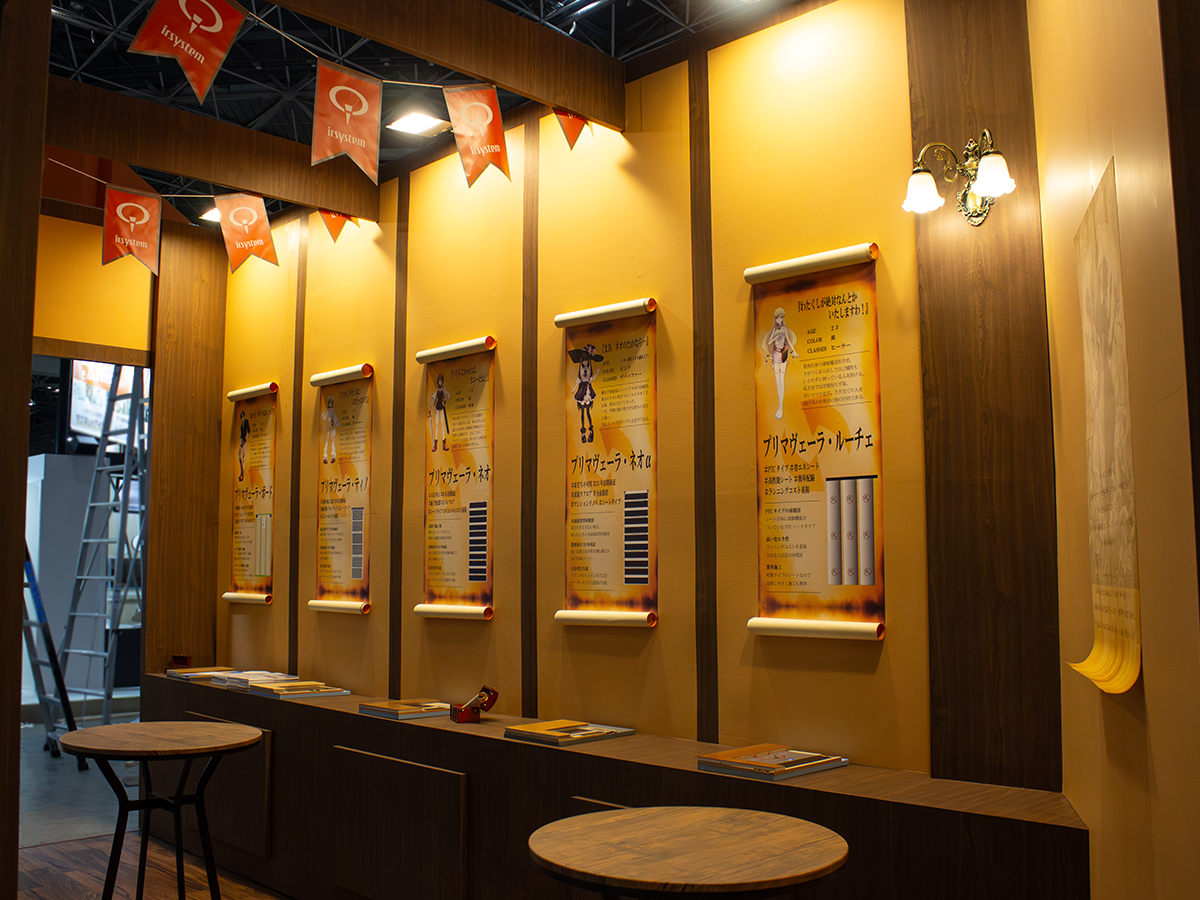ご要望いただいた”ゲームの中のギルド酒場のような世界観”をブースに落とし込みました。照明は暖かみのある電球色を採用。壁面のグラフィックは巻物風にデザインし、実際に紙の上下を巻いてリアルに再現。初めての試みでしたがデザイナーと施工管理、表具担当と相談・検証を重ねて細部までこだわり実現しました。会期中はアルステム様がキャラクターに扮してブース運営されており、世界観が見事に出来上がっていました。
