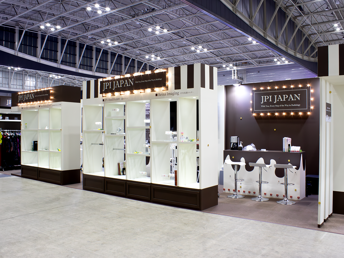 いつもテーマを設定されブース全面にその世界観を展開されるJpi様。今回のテーマは「チョコレートのイメージ」とのご要望です。板チョコのブロックやとろける表現をグラフィックや造作に盛り込み、ストライプ柄やガーランドライトを組み合わせることで、ポップな印象をプラス。全体はホワイトとチョコレートカラーであるブラウンの2色で統一し、装飾性を保ちながらも商品を際立たせるブースとなりました。