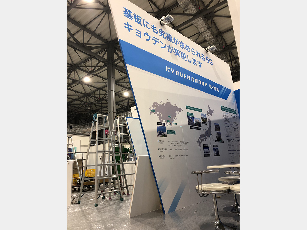 斜めデザインを造形に取り入れたブース。コーポレートカラーのブルーと壁面全面のグラフィックが清潔感を引き立てます。パラペットに記載された商品サービスの告知、三角アクリル什器を通路側に配置し、来場者のブース内への誘因効果を高めました。