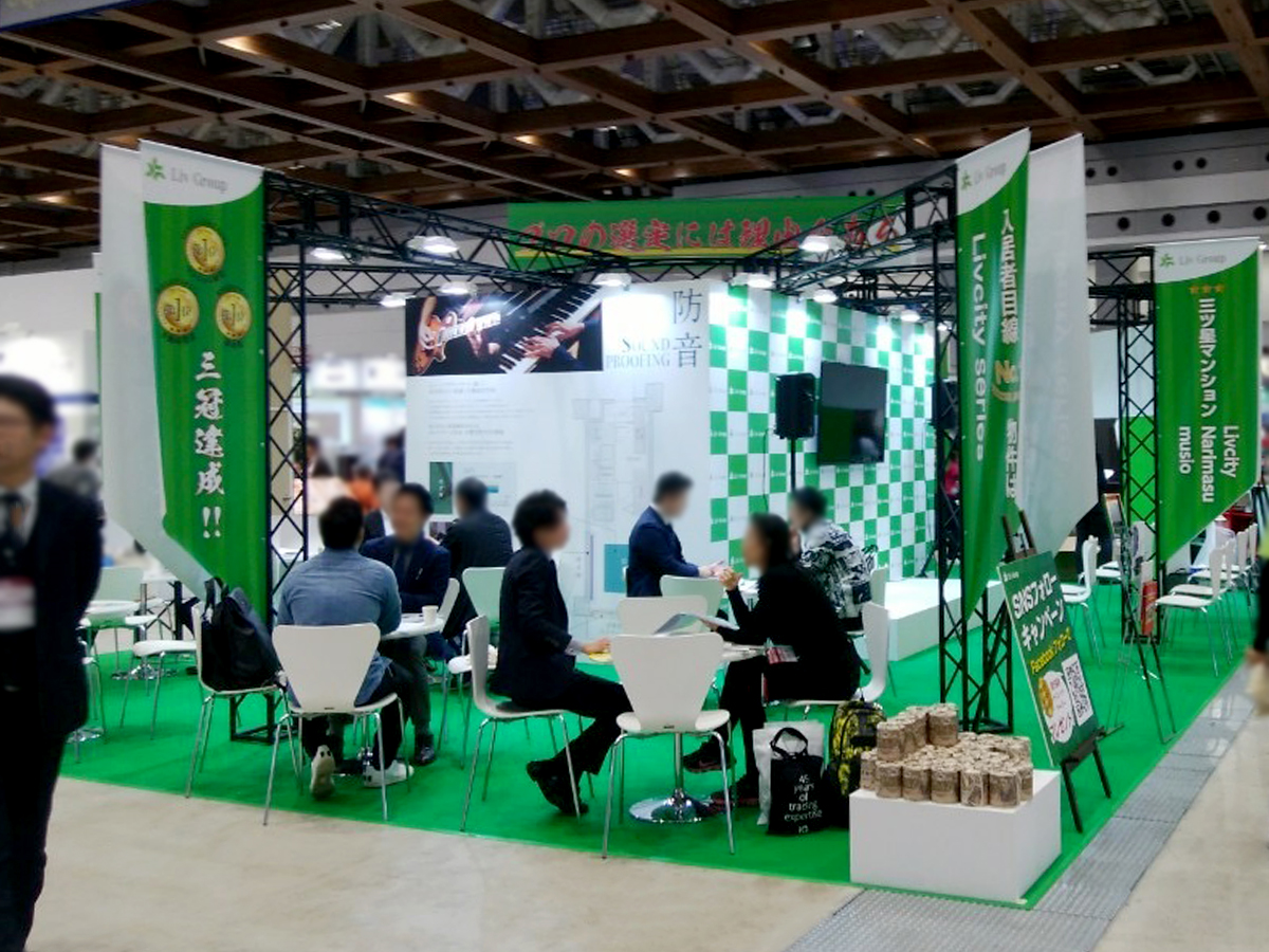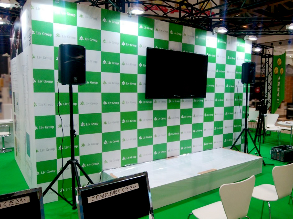 セミナーと接客をメインとした、大型ブース。コーポレートカラーのグリーンをベースに白のテーブルとイスで清潔感のあるスペースとなっています。ブースセンター上部には、回転看板を掲げインパクトを与え、バナーと各壁面の大型グラフィックで告知内容を明確にし、多くの来場者をブース内へ誘引しました。