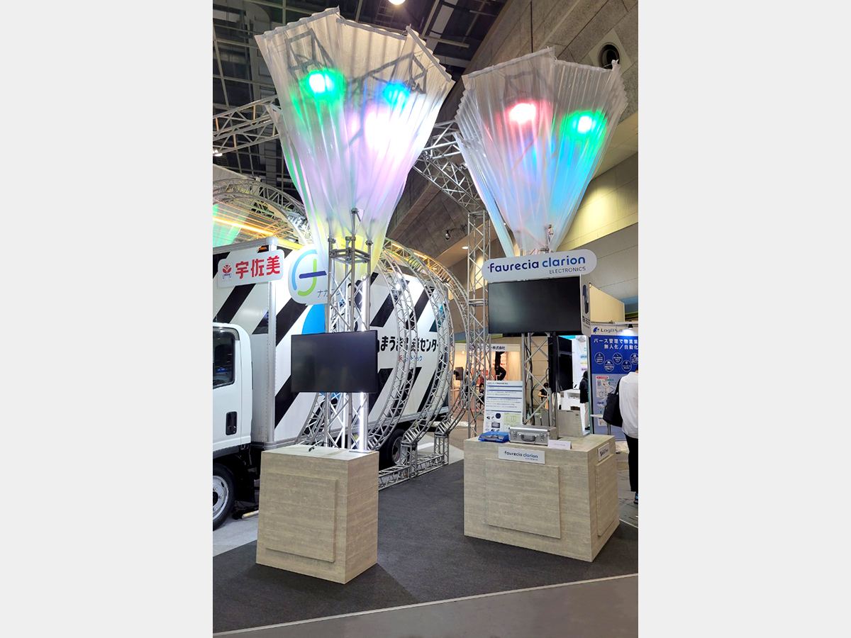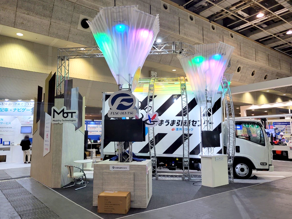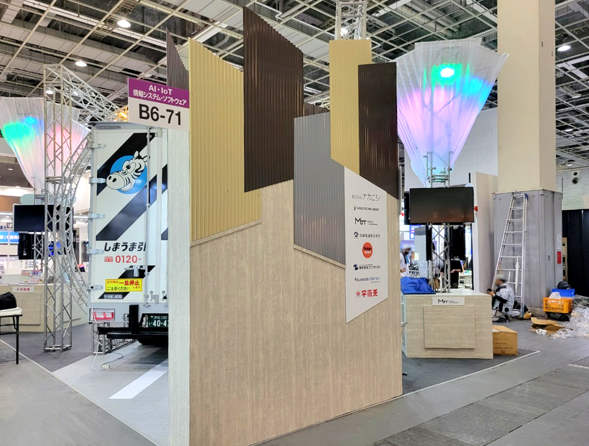 3Dカメラ荷室掲載率計測システム、ロボット点呼、運送業務管理クラウドサービス、タイヤ空気圧センサー、デジタコ・ドラレコ電装品、その他様々な展示をしたブース。5m越えのトラス組みでこだわりの照明が目印のブースとなりました。中西商会株式会社様公式サイト:https://nakanishi-shokai.com