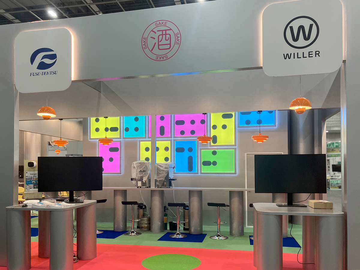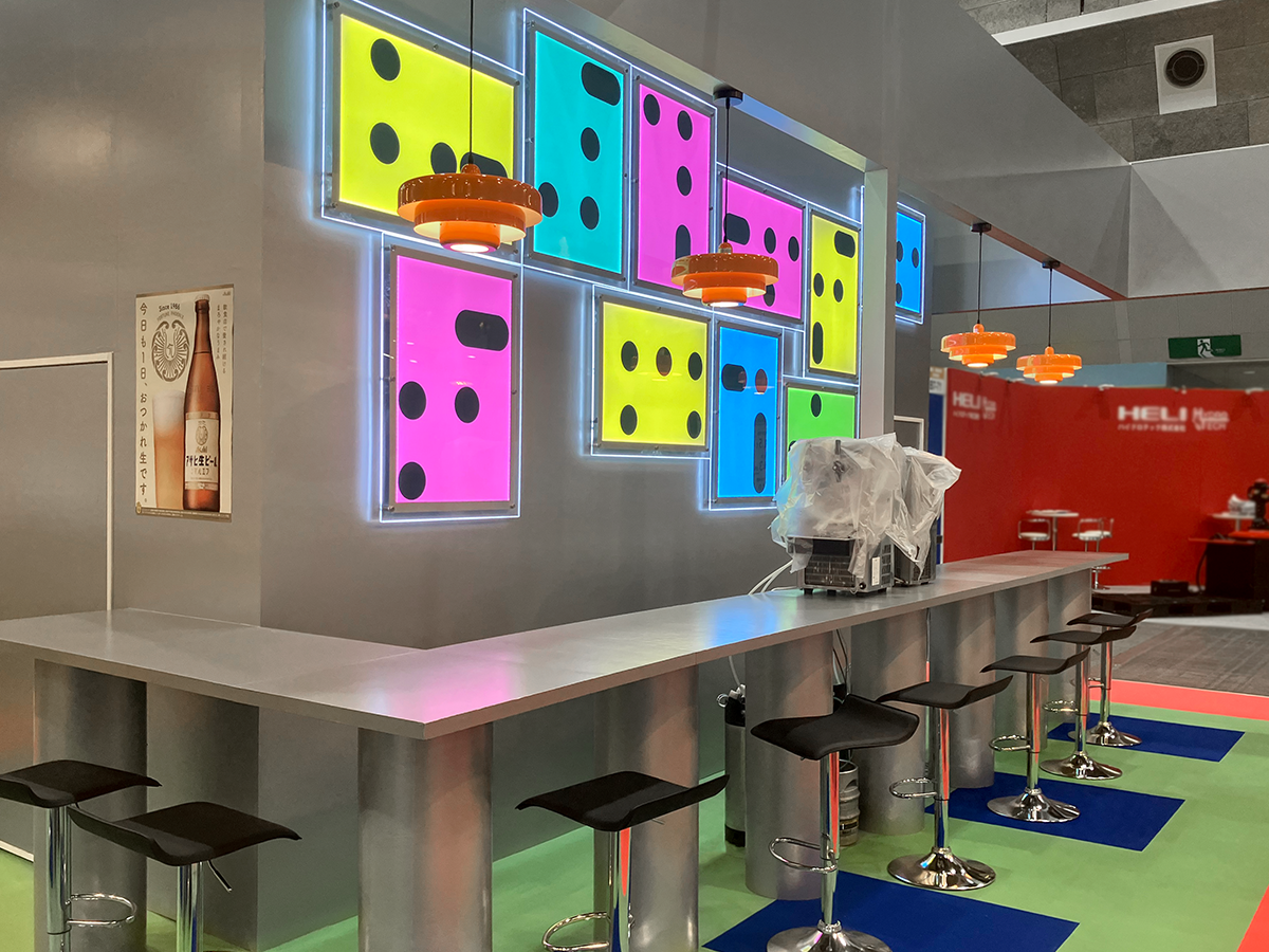 ナカニシ様より「来場者が、なんだろう…と驚くようなブースを」とのご要望をいただき、今回は“レトロフューチャー”をテーマにデザインいたしました。外観はシルバー基調と間接照明でレトロな未来的を演出し、ブース内部は懐かしさを感じさせる照明やセレクト家具、床の張り分け等にこだわり、レトロな要素を盛り込んでいます。お酒・ドリンクの提供もあり、来場者とのコミュニケーションを促進する、今回も話題性の高いブースとなりました。