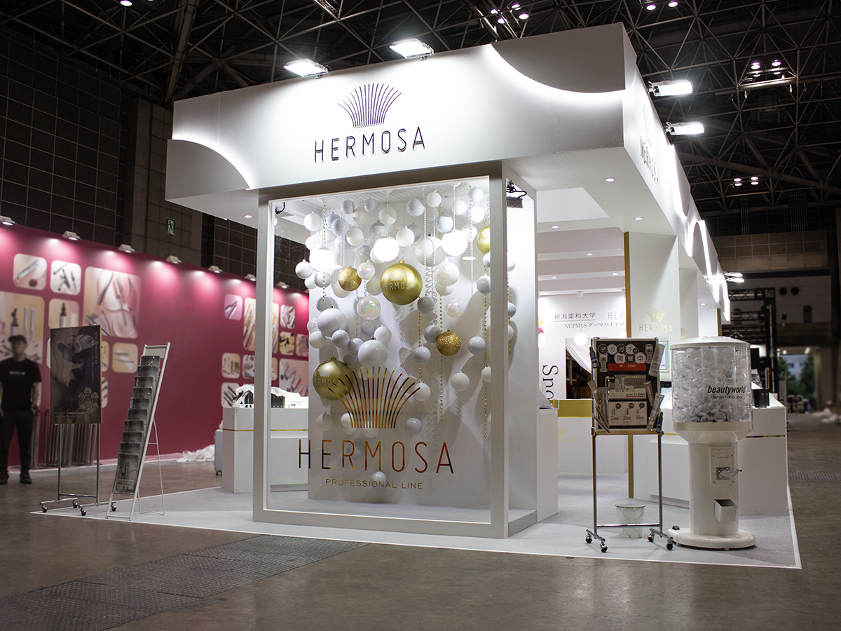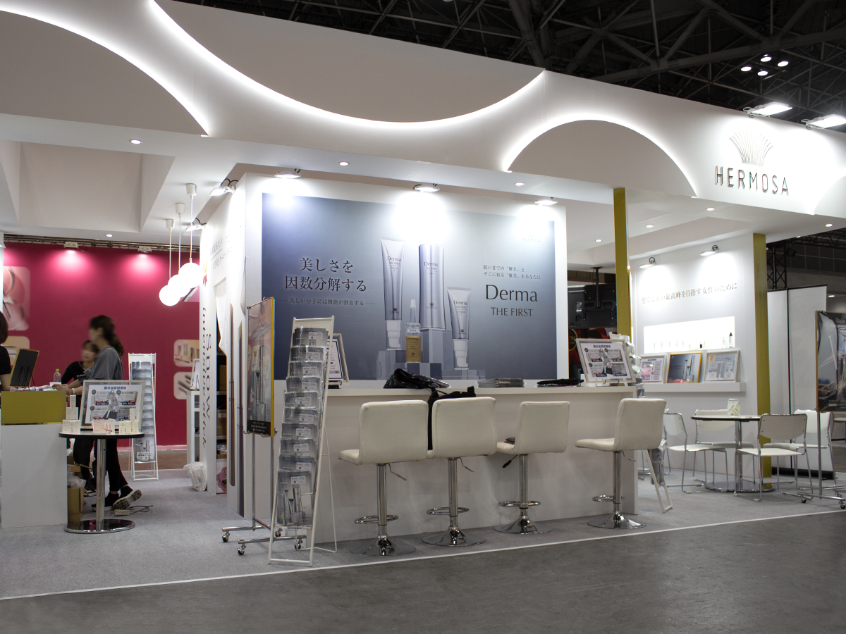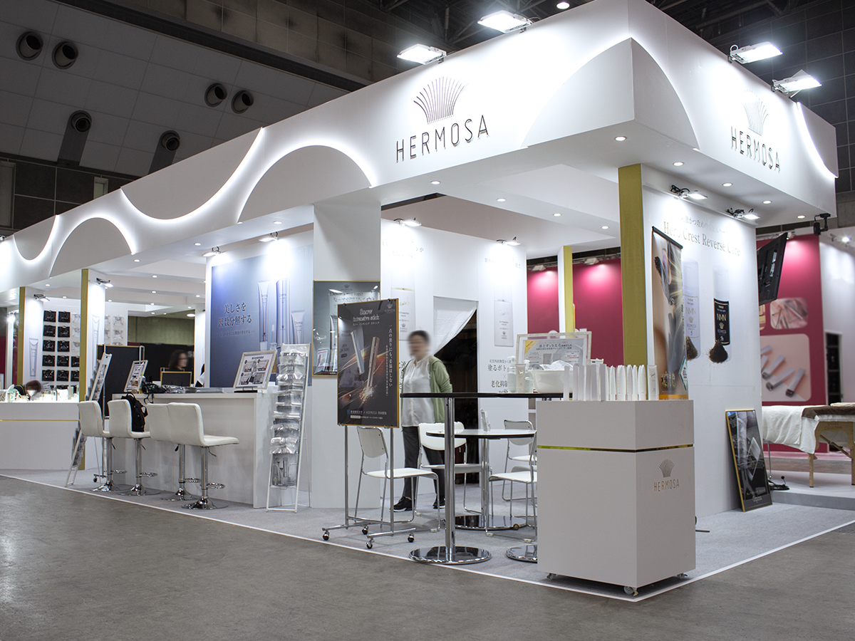 デザイン設計から施工まで担当させていただきました。白を基調に照明効果、光を多く取り入れた明るいブースデザイン。シンプルな構成に、フォトスペースとなるディスプレイや、ペンダントライト・ボーダー部分の間接照明などに円、丸、球体のフォルムを取り入れ目を惹くブースに。4ホール入口からすぐという小間位置を最大限に活かせるよう、来場者が思わず足を止めてしまう仕掛けを多く盛り込みました。