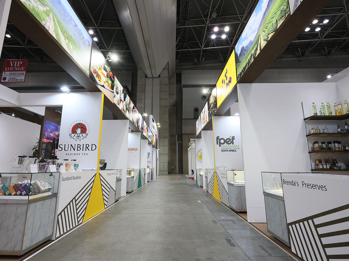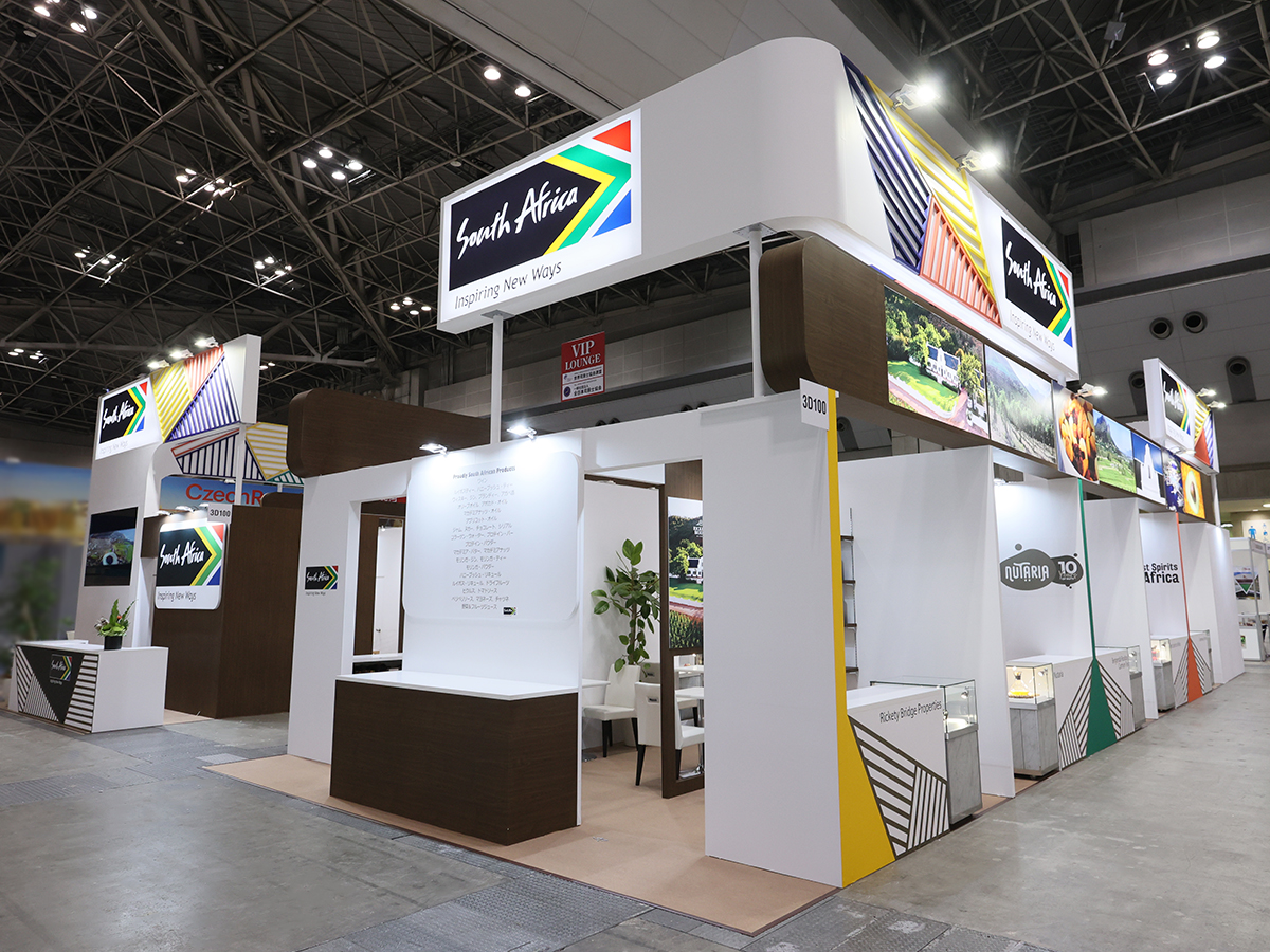 南アフリカ大使館様より直接お電話で問い合わせをいただき、コンペにて採用していただきました。25m×15mという大小間でした。現地南アフリカとzoomでのお打ち合わせ、英語でのメールのやり取りで、安心して施工日〜展示会本番を迎えることができました。