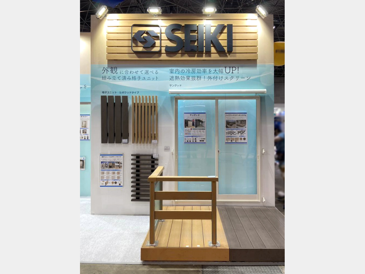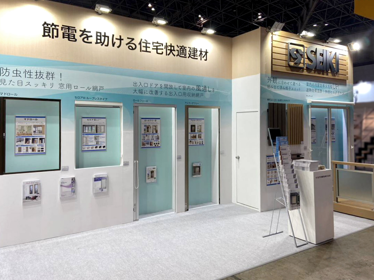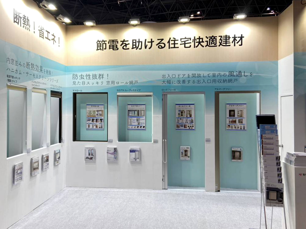 夏の会期に合わせた涼しげなブースをというご要望でした。グラフィックはメイン商材である網戸を涼しげに見せられるように風をイメージし、ライトブルーのグラフィックと木目で爽やかな印象のブースとなりました。