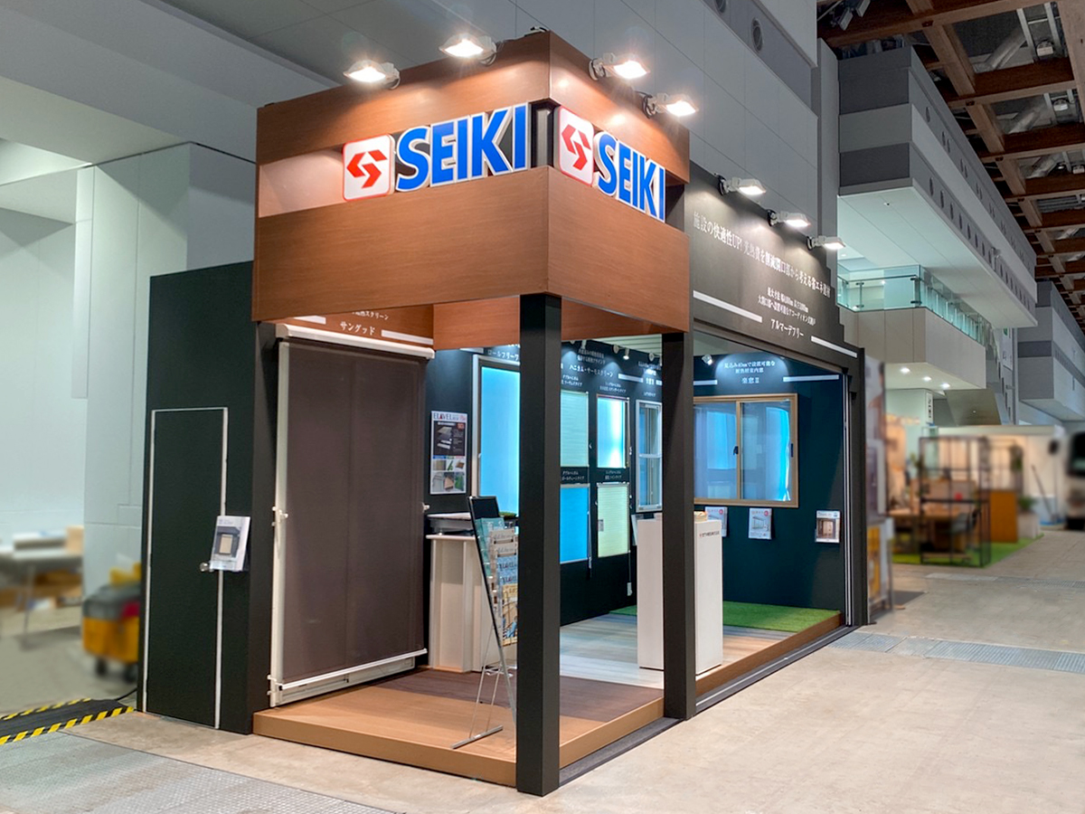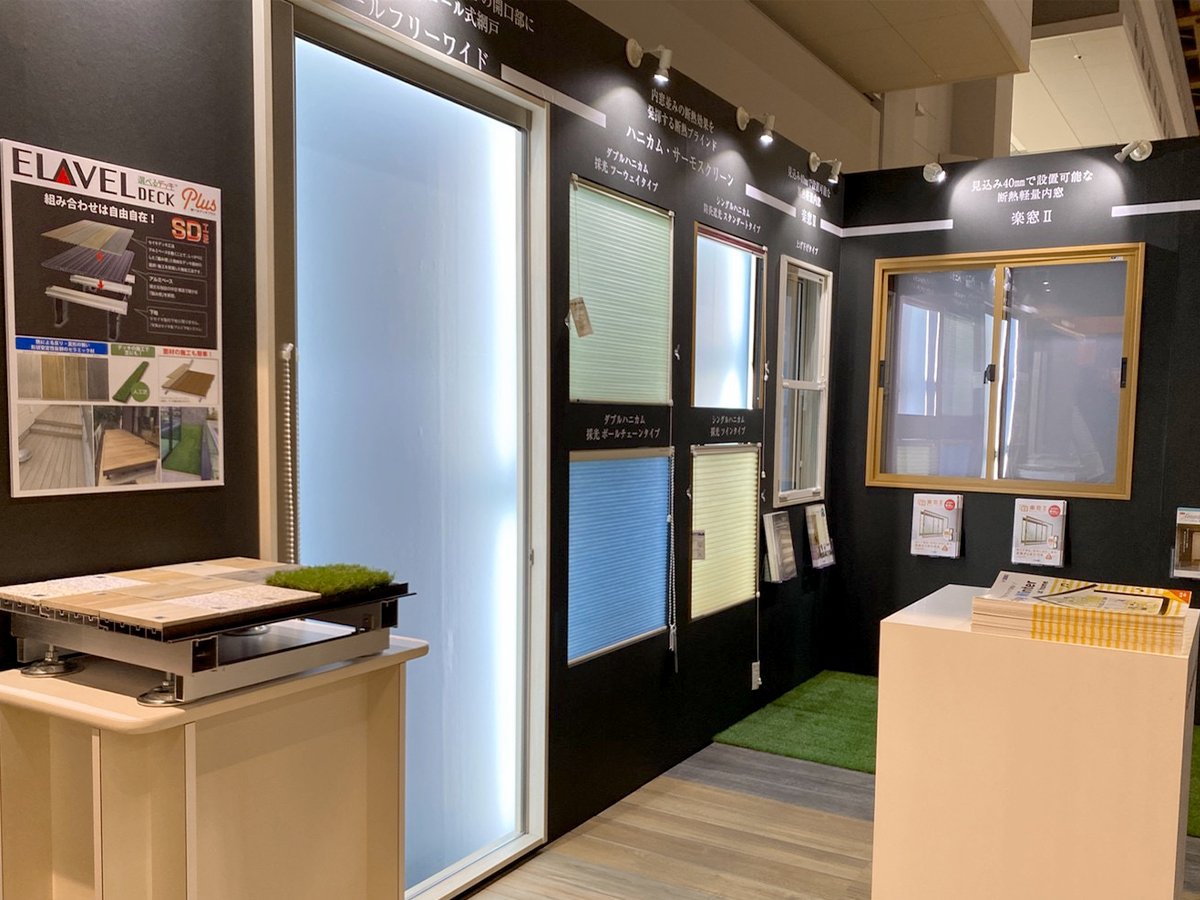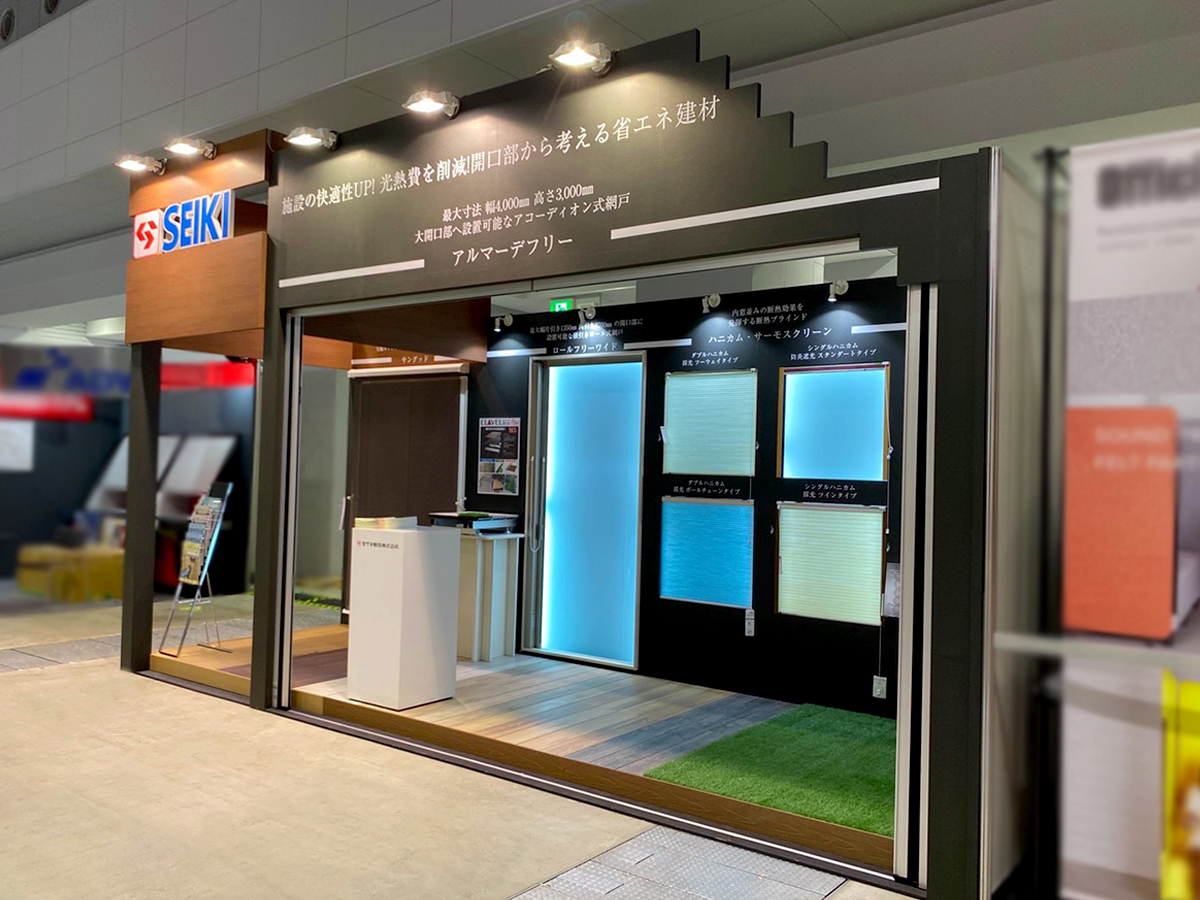 建材展示も兼ねた構造のブースをデザインいたしました。一つ一つの建材を理解してブースに組み込んでいくことでレイアウトも必然的に決定。社名ロゴはパネル厚に合わせた木工の箱文字で製作し、アイキャッチとなりました。
