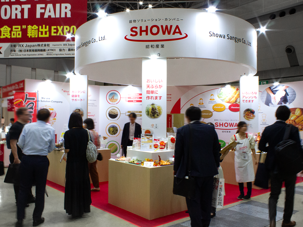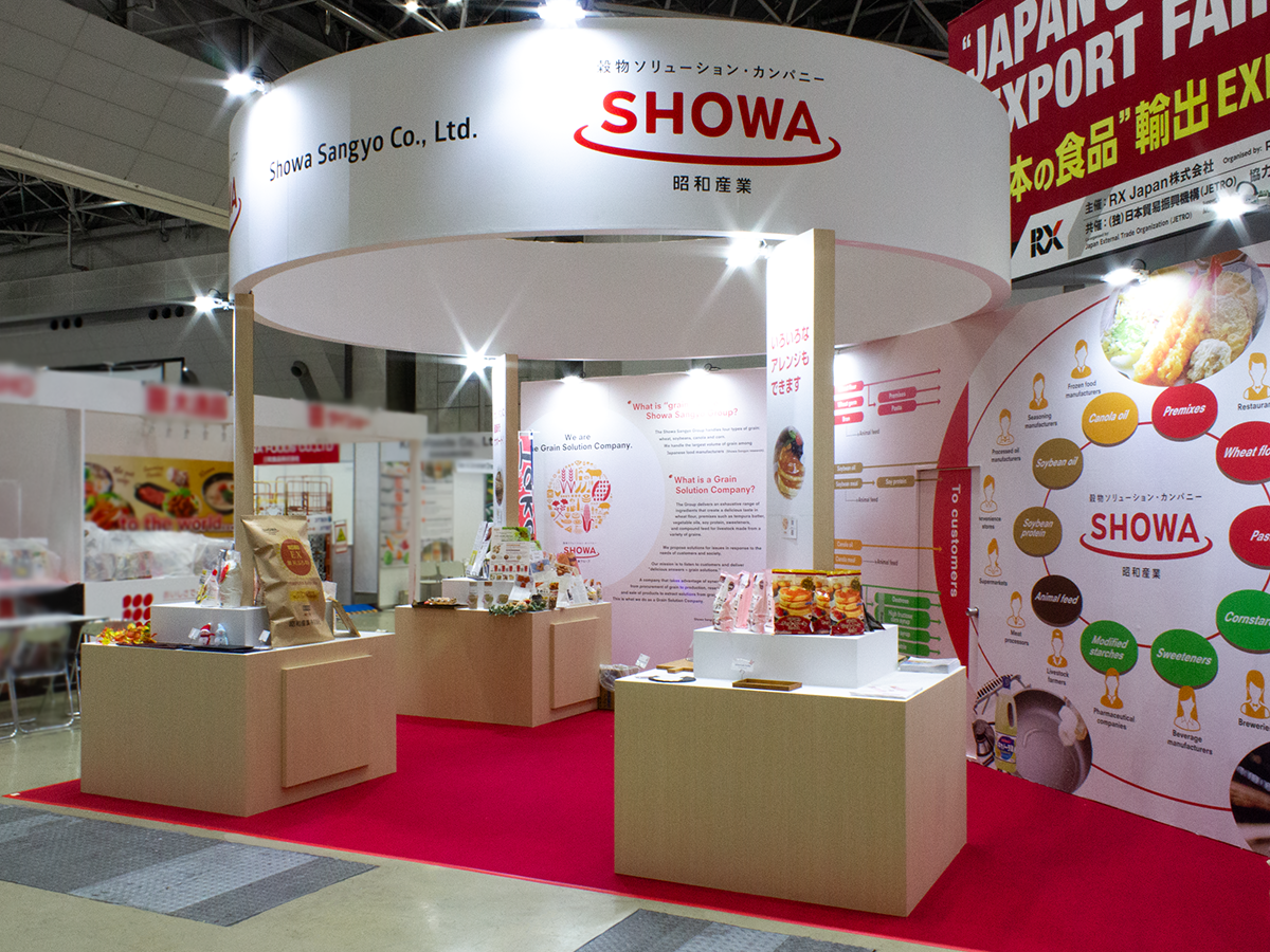 HPをご覧になってお問い合わせくださり、コンペにて受注させていただきました。”日本の食品”輸出EXPOの特徴として海外の来場者様も多いということで、コーポレートカラーの赤と白をはじめ、木目を利用して和を感じられるテイストにしています。展示台上のディスプレイは昭和産業様がご自身で手掛けられ、壁面グラフィック含め食品展らしいブースとなりました。