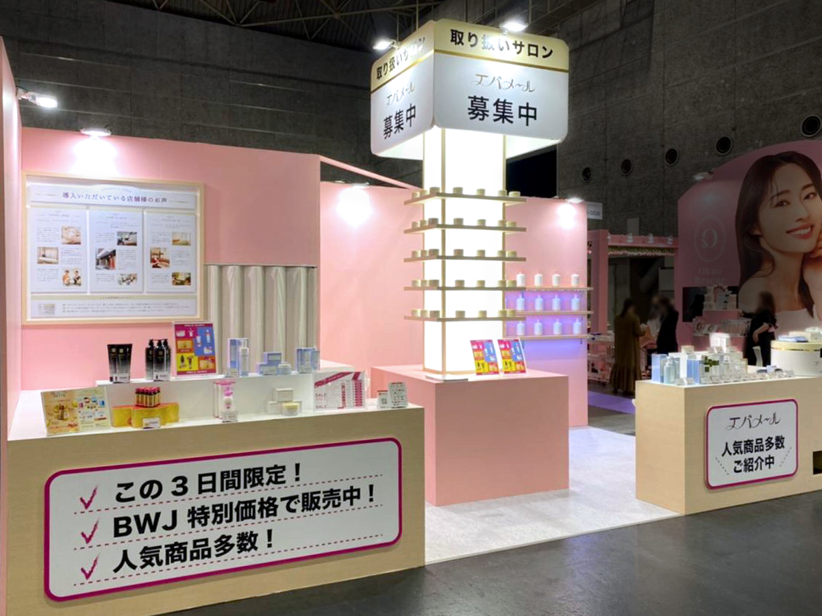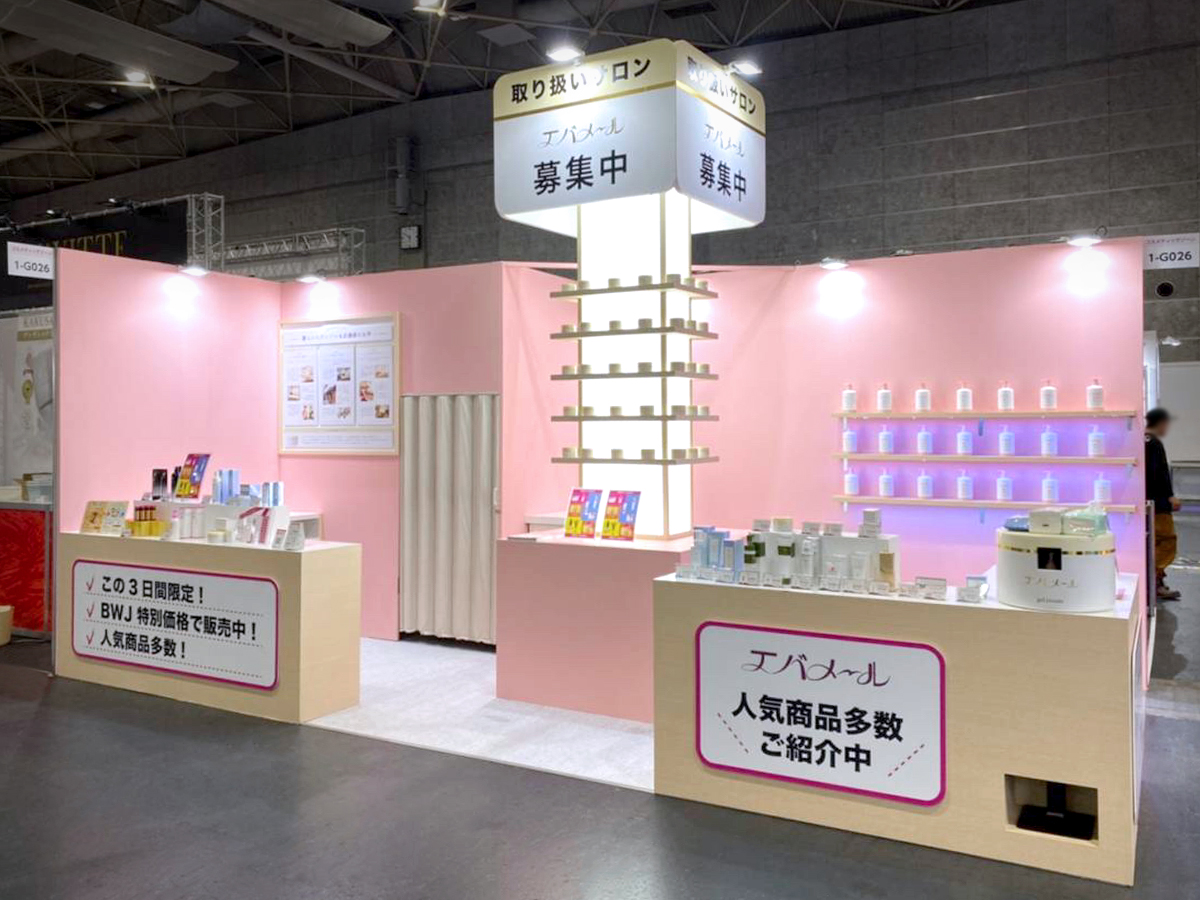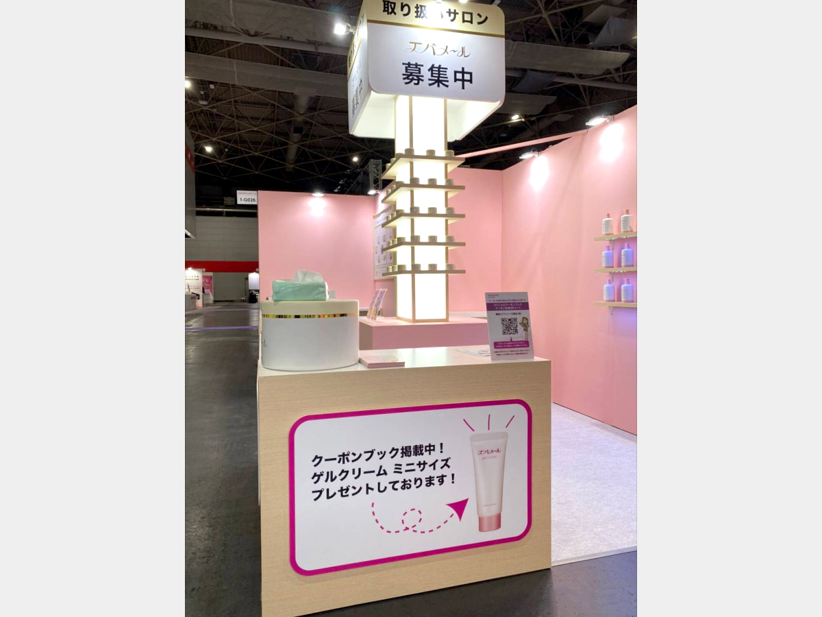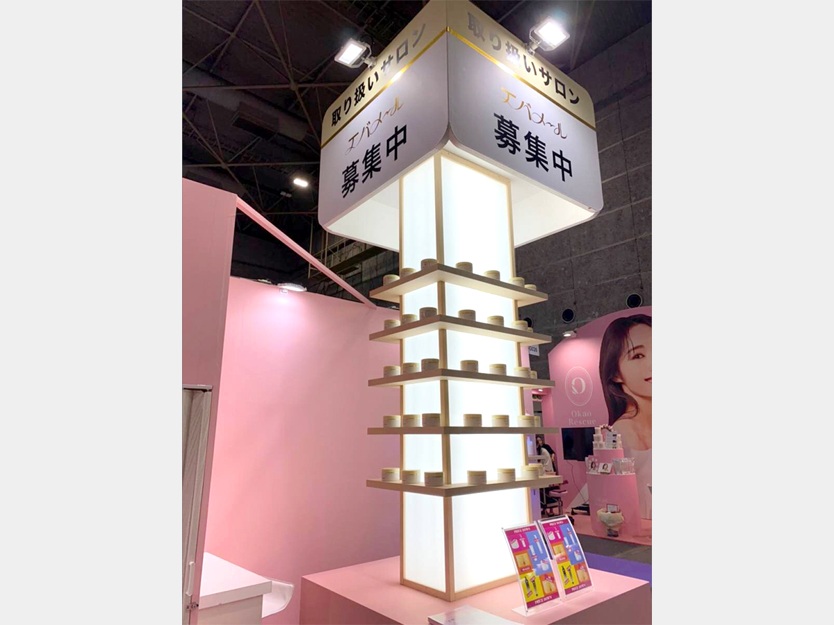 メイン展示商品となる『エバメール ゲルクリーム』をイメージしたブース。アイキャッチにした、行燈タワーが目を惹きます。前回のダイエット&ビューティーフェアで製作したBigなテスターオブジェが今回も大活躍しました。銀座ステファニー化粧品(株)様公式サイト:https://ginza-stefany.com