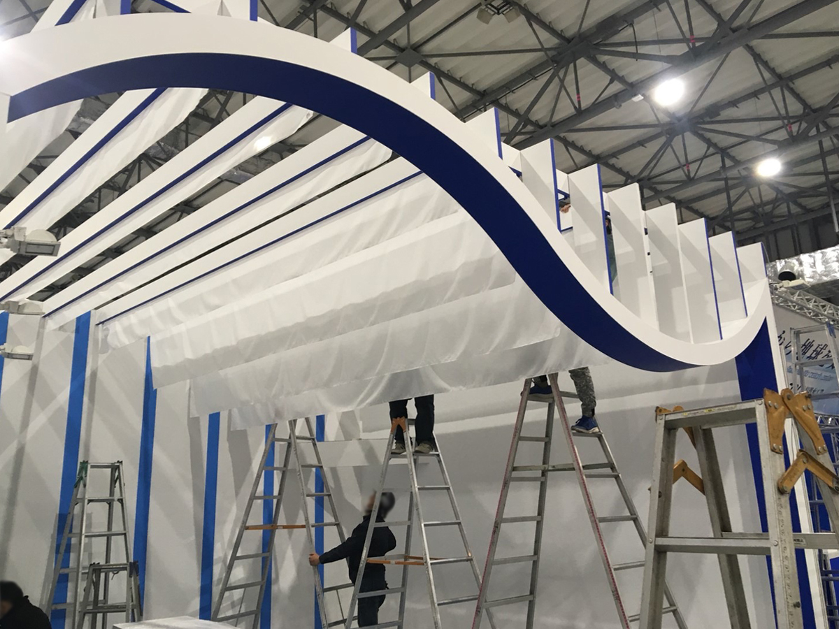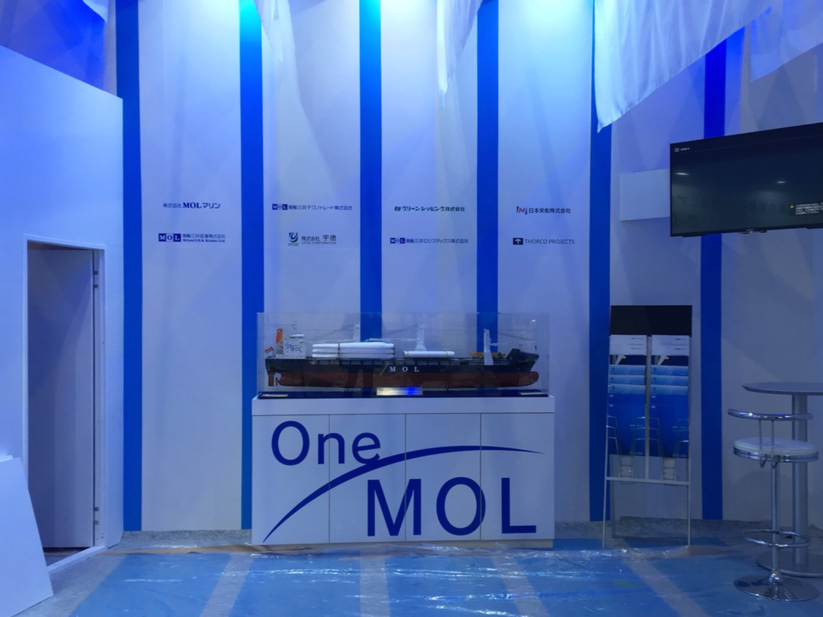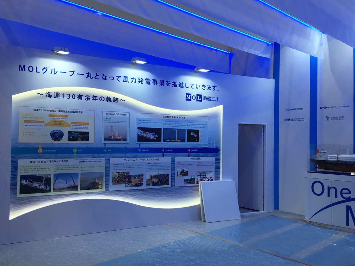 未来へ向かって駆け抜ける風を表現したブースデザイン。商船三井様が新たに風力発電事業に漕ぎ出したことを造形で表しました。波型の造形で風や波を表現し、天井のファブリックは船の帆をイメージ。コーポレートカラーのブルーの光で未来感を演出しました。