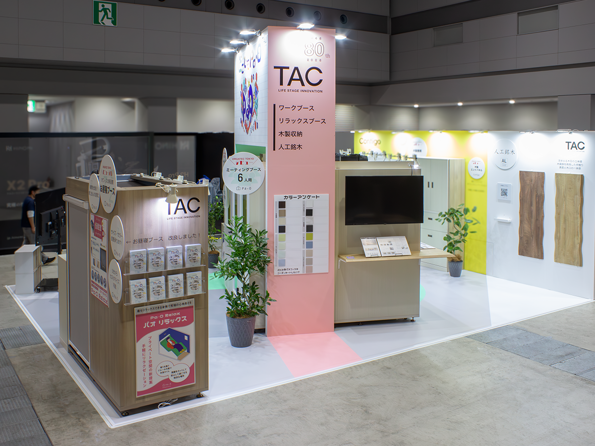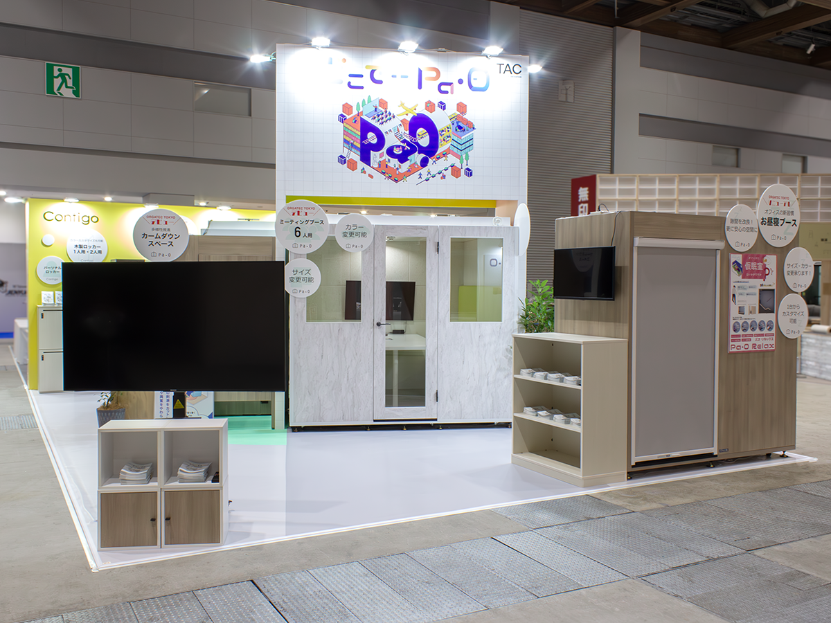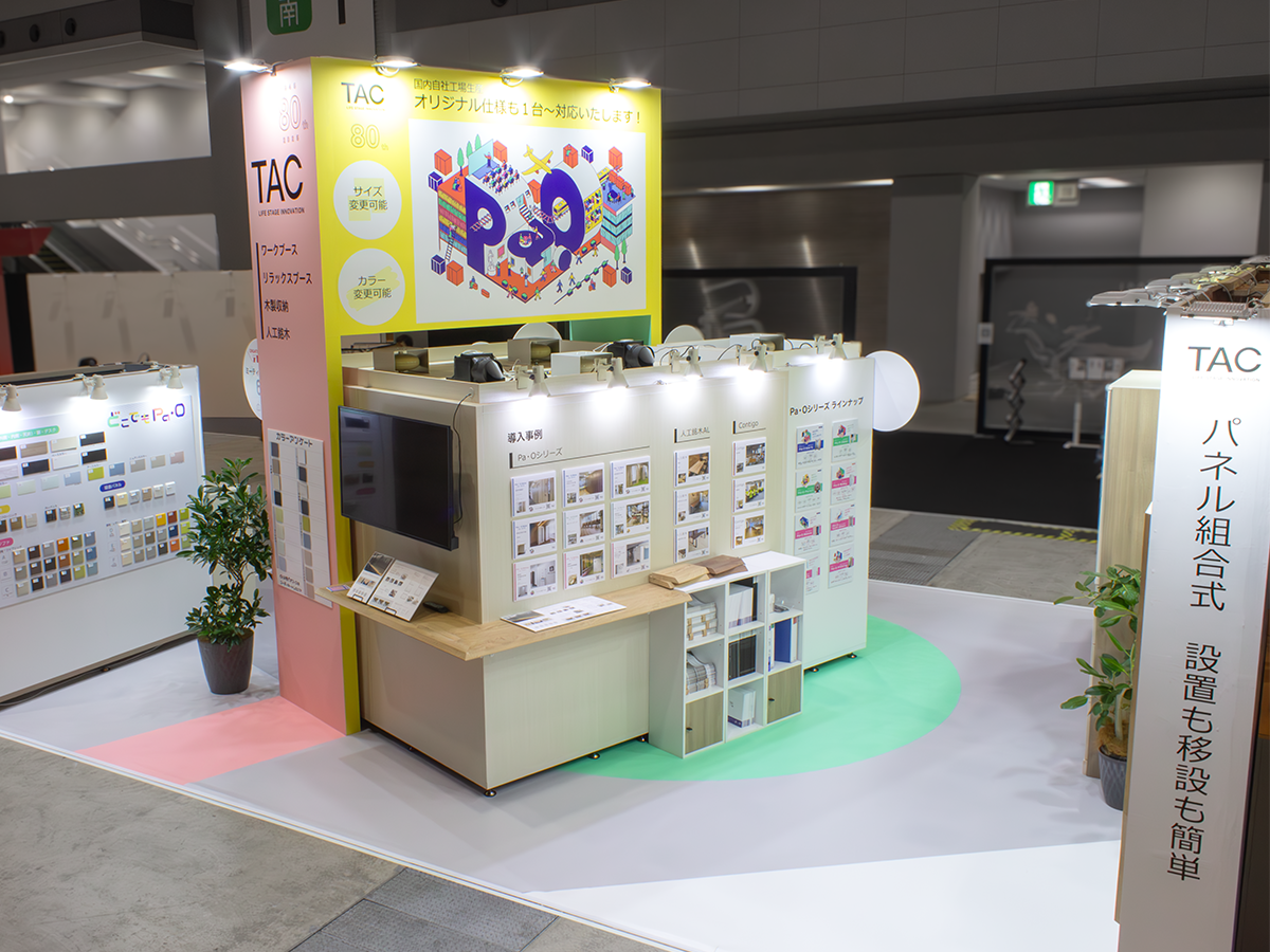 デザイン設計から施工まで担当させていただきました。前回に引き続きペールトーンの配色でブースを構成。ワークスペースのブースという大きな展示品を設置しながらも、床の貼り分けやカラー使いでエッジの利いたブースとなりました。