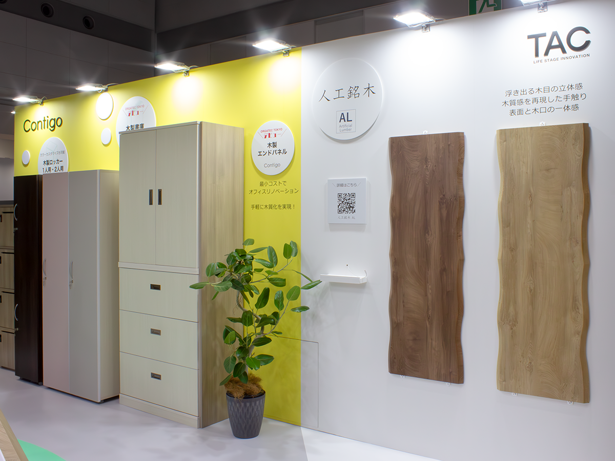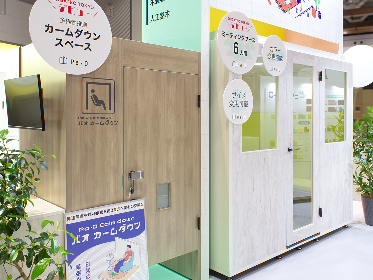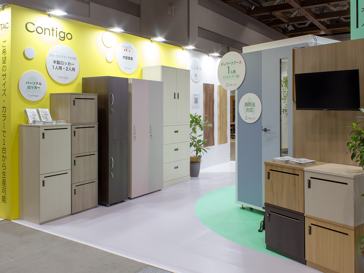 デザイン設計から施工まで担当させていただきました。前回に引き続きペールトーンの配色でブースを構成。ワークスペースのブースという大きな展示品を設置しながらも、床の貼り分けやカラー使いでエッジの利いたブースとなりました。