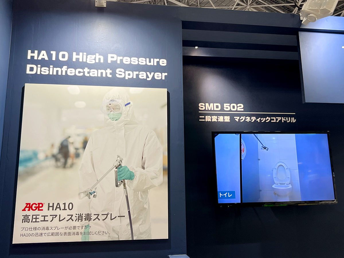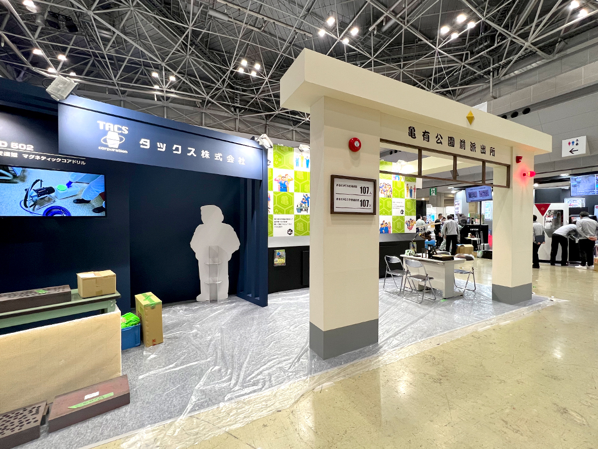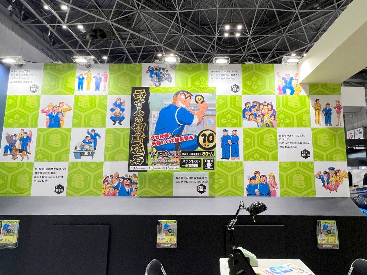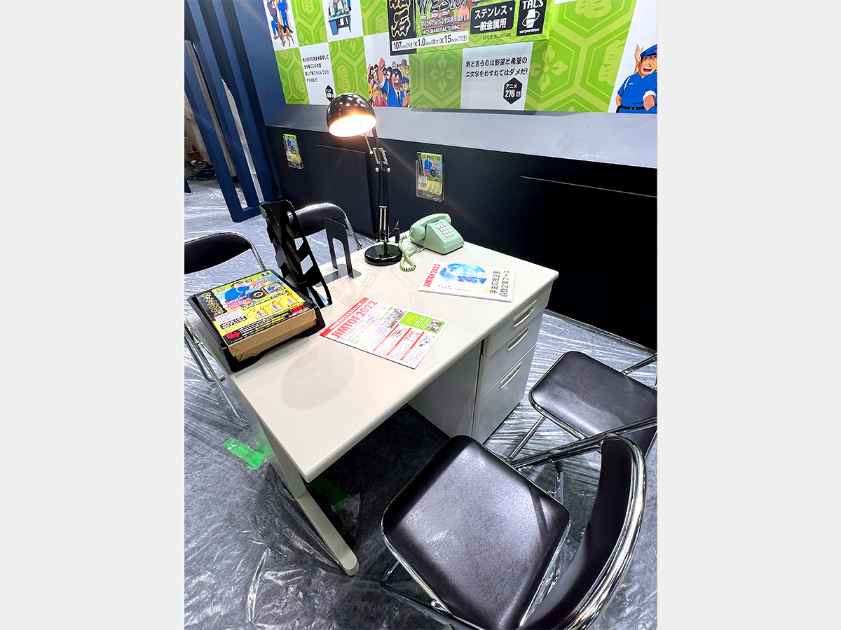 タックス株式会社様の新商品「両さんの切断砥石」がメイン展示のため、こち亀の交番を再現したブースに。奥左側には消毒スプレーやドリル等も展示しておりますが、メインのこち亀の世界観で来場者の目を引きます。