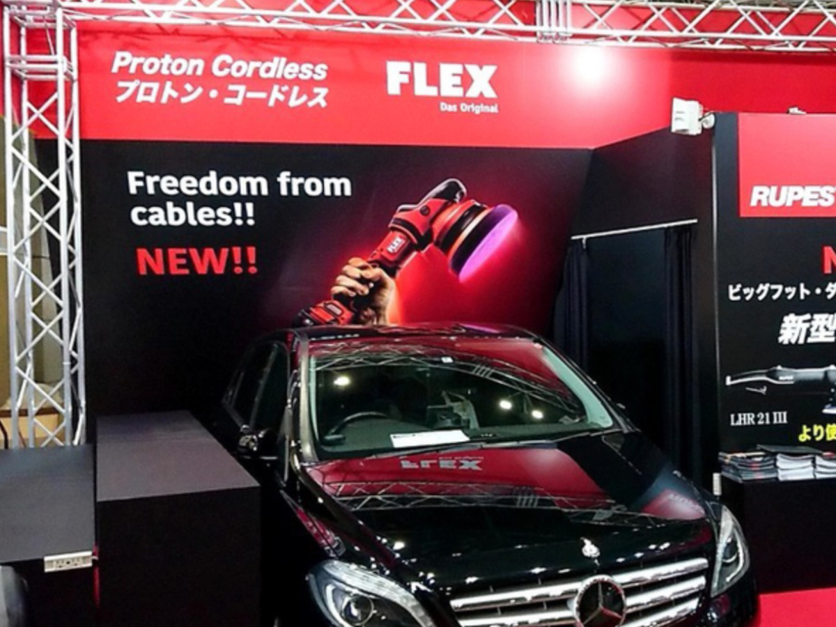 トラスを構造体としたCOOLなデザインに車両も展示し商品訴求。イメージも伝わりやすく新製品5機種を中心にデモも行いました。