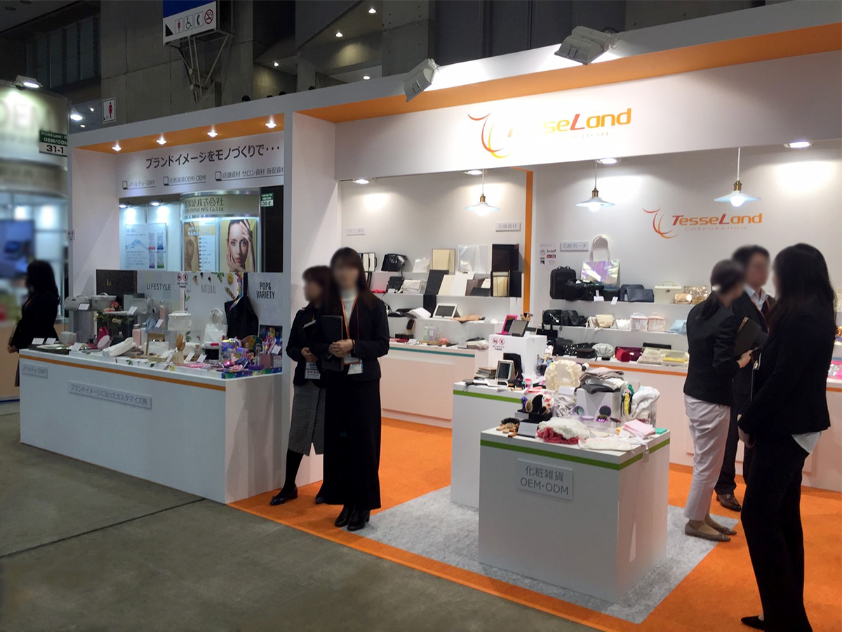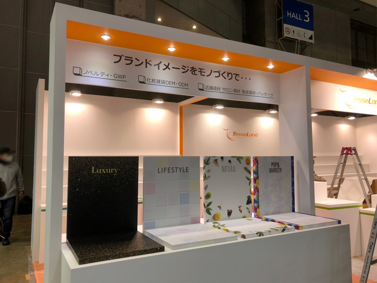 前回のブースをブラッシュアップし展示商材に合わせ細部のテクスチャや素材に変化を出しました。テッセランド様らしい、コーポレートカラーを活かしつつも親しみやすい雑貨屋さんの様な雰囲気に。テッセランド様から「初めてブースデザインの大切さが分かった!」と大絶賛の声を頂きました。