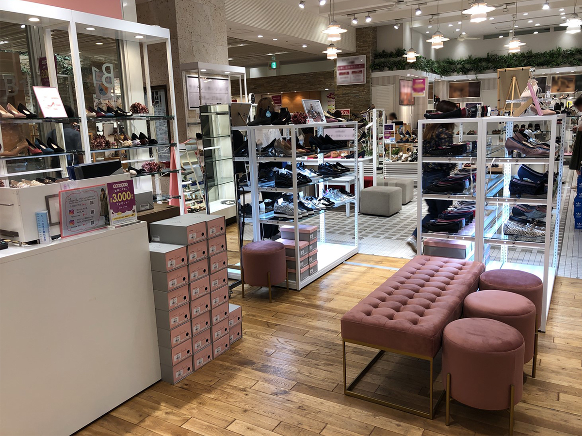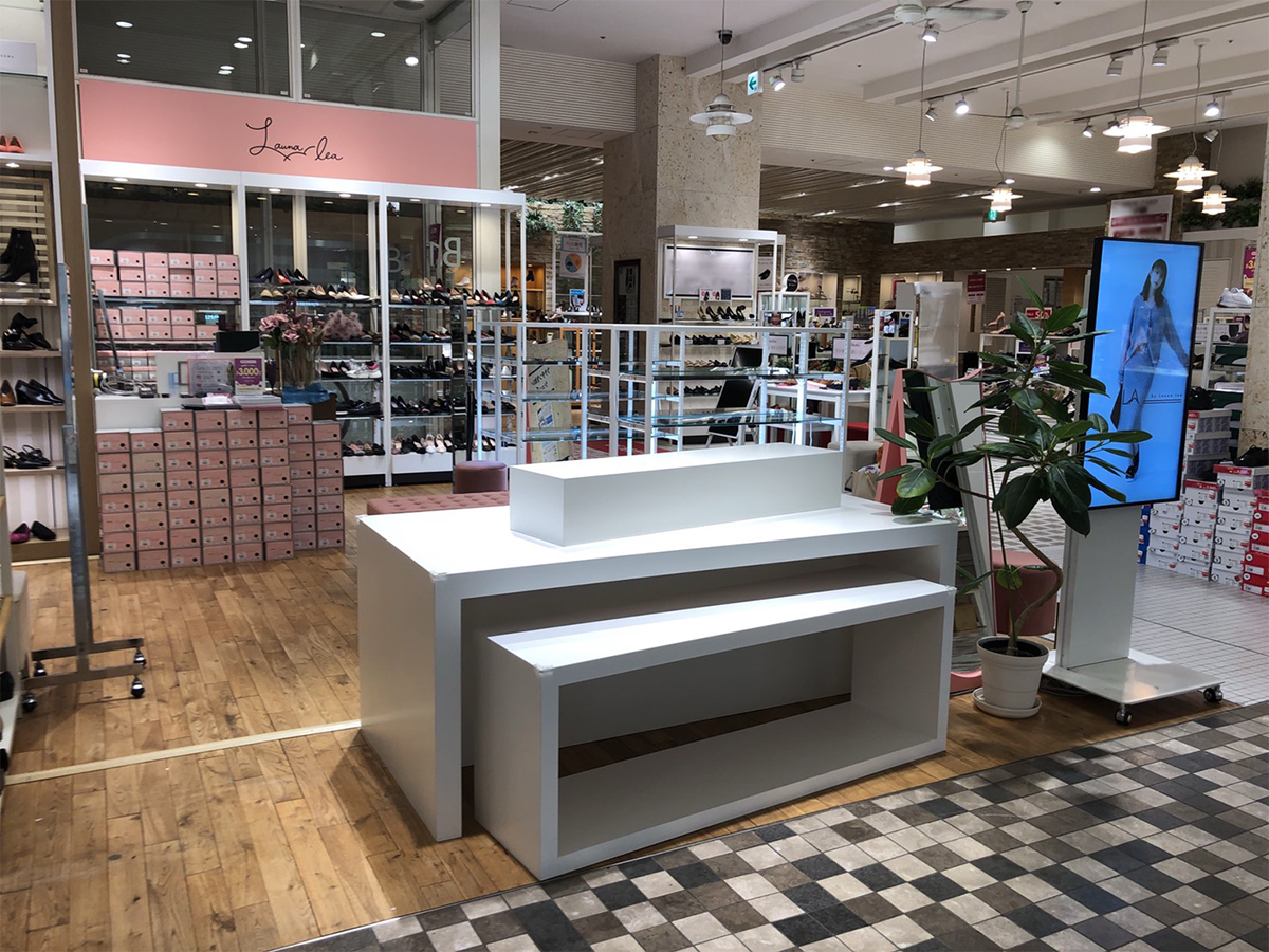 POP UP STORE の出店で好評価を頂き、商業施設内常設店舗の改装をご依頼頂きました。メインのディスプレイ什器はオリジナルで制作。ディスプレイと靴のストックの役割を兼ね揃えています。